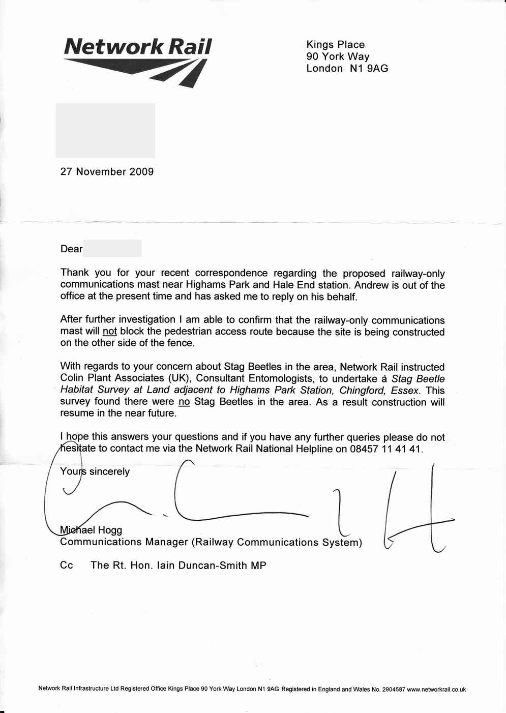 Network Rail are to erect an 18m tall communication mast at Highams Park Station. It will be sited in the greenspace next to the footpath from the Chingford bound platform. We understand it will be a thin open lattice structure. The mast will be part of a national network of masts to provide communications between train drivers and signallers. The planning rules for such structures are unusual in that Network Rail are not required to go through the normal planning process.