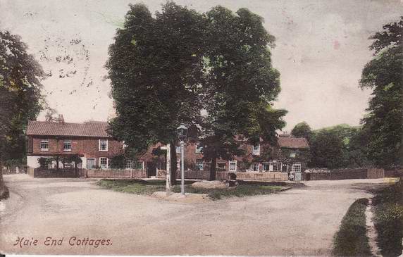30th January 2010 - Hale End Cottages circa 1905 The picture below is from the rear of a postcard which is postmarked 27th October 1905. It was kindly sent to us by a reader of this website in South Australia who found it when having a clear out. The original photo was in black and white but was obviously hand tinted to add the colour before being printed as a postcard. The exact date of the photo is unknown but is presumably just a little before the 1905 postmark. The photo shows the familiar triangular junction where Hale End Road is joined by Oak Hill (the current location of The Royal Oak Pub).