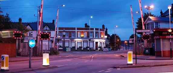 June 2009 - The Level Crossing in the late evening - Without Cars! Here are two dramatic pictures of the level crossing taken on a late June evening by Malcolm Shykles. Due to some local road works he was able to capture the scene without any vehicles. To create the panorama effect, each scene actually comprises two photos joined together using Panorama Maker 3.