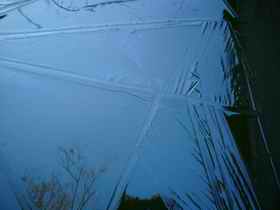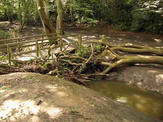 16 June 2009 - Storm rains uproot trees and test the bridge The very heavy rains during the evening of 15th June 2009 temporarily raised the level of the River Ching beside the lake and uprooted trees. This was the scene the afternoon of the day after. Broken boughs have been swept against the bridge over the river (next to the lake). Looking at the "tide mark" it suggests that at one point the river level was over the bridge floor. It's surprising it wasn't washed away. Full credit to its builders for "screwing it down" so well.