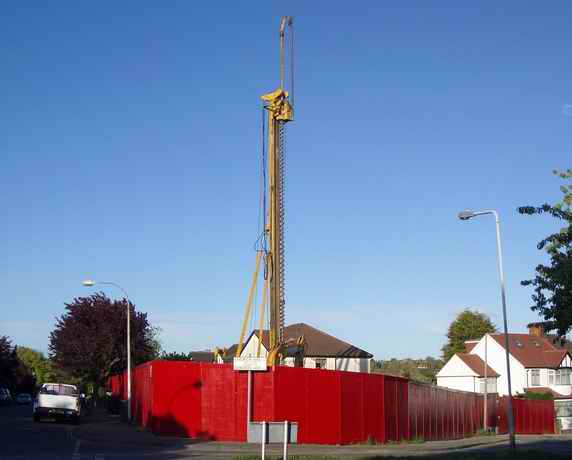 24 April 2009 - Piling has started on the Handsworth Ave/Church Ave site Development (of a block of luxury flats) has now commenced on the site of the former Methodist Church. The tall yellow piling derrick is visible from much of Highams Park.