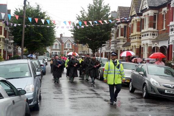The Waltham Forest Pipe Band marched in torrential rain from Highams Park station to Vincent Green to open Highams Park Day 2011 on Saturday (16th July). A group of hardy locals with umbrellas marched along with them to give support.