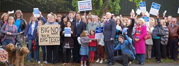 30th October 2009 - Demonstration against proposed Tesco development Around 130 people assembled at lunchtime in Jubilee Avenue on Friday 30th October 2009 to demonstrate against the proposed Tesco development at that location. Tesco's plans for a large store plus dense housing was narrowly approved by LBWF planning committee on 13th October. The proposal now needs the approval of London Mayor Boris Johnson and the Government office for London. MP Iain Duncan Smith attended and addressed the demonstrators. He explained that he too was against the development and was doing all he could to lobby the decision makers.